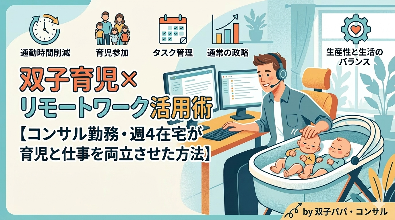 この記事を書いた人:コンサル勤務・双子育児中の父親。週4リモートワークと双子育児を両立している実体験をもとに書いています。