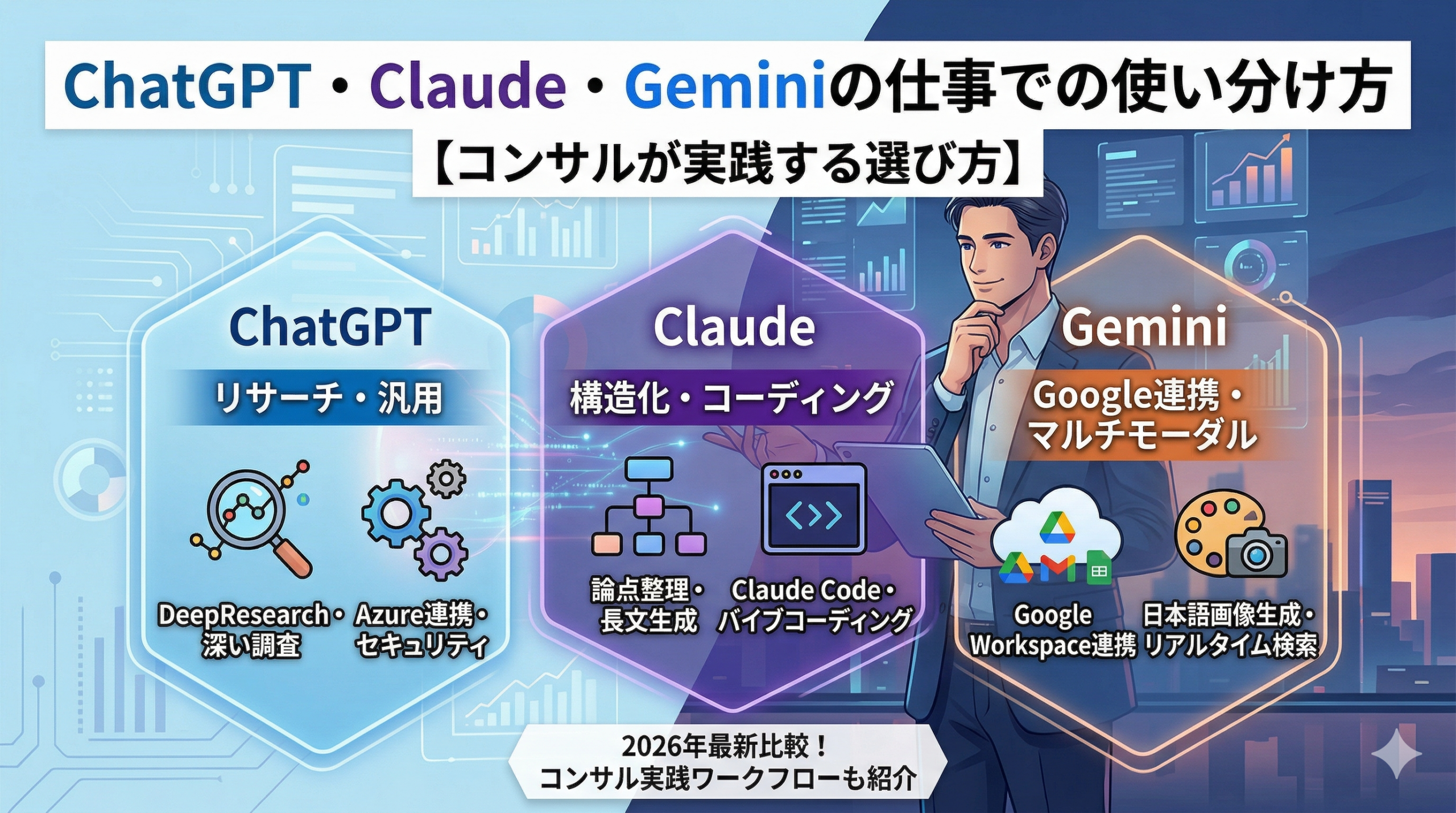 コンサルとして日常業務でChatGPT・Claude・Geminiを使い分けてきた経験から言えば、3つを使いこなすことで得られる生産性の向上は、1つだけ使い続ける場合とは比較になりません。この記事では、それぞれの特徴と具体的な使い分け方を、2026年時点の最新情報とともに解説します。
